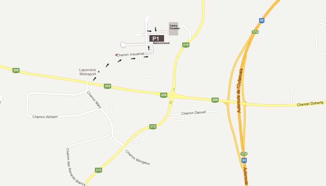 De l’autoroute 50 prendre la sorti 309 Nord pour environ 1.5km, tourner à droit sur chemin Industriel et suivre la signalisation
